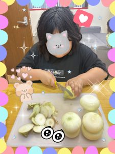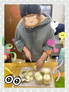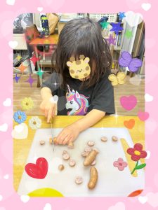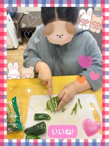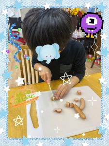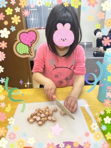 まずはウインナー、ピーマン、玉ねぎを丁寧にカット。包丁の使い方に気をつけながら、みんなとても上手に切ってくれました。