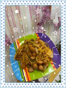 野菜に火が通ったら、茹であがったパスタをフライパンに入れて、ケチャップとウスターソースで味付け。