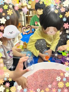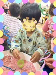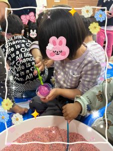 手でサラサラとすくったり、カップに入れてジャーっと流したり、お友だちと分け合ったり…思い思いのスタイルで夢中になって遊ぶ姿がとても印象的でした。