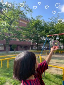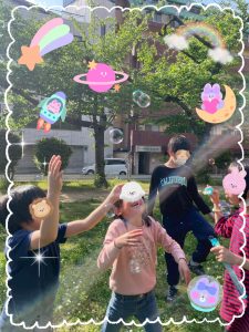 風にのって空に舞うシャボン玉とともに、みんなの笑顔もキラキラ輝いていましたよ〜!