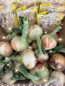 机いっぱいに並べられた食材を見て、子どもたちは「わあー!すごい!」と大喜び。中でも、アトム農園で収穫した無農薬の玉ねぎは大好評!「これ、甘くておいしい!」と、たくさん食べてくれました。