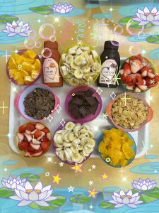そこに、好きなフルーツやコーンフレーク、チョコやキャラメルのソースをトッピング!