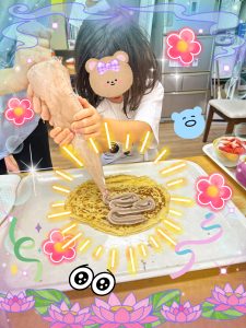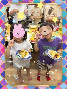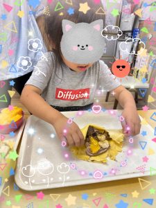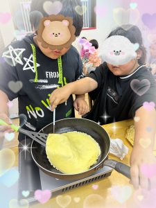 「薄〜く焼くのがポイントだよ」と伝えると、みんなフライパンと真剣ににらめっこ👀