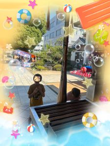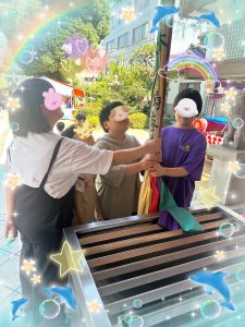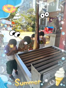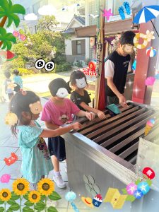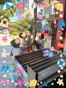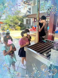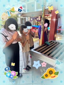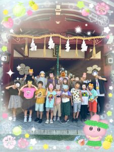 地域のにぎわいを感じながら、「夏祭りが無事に楽しく行われますように」と、みんなで気持ちを込めてお参りをしてきました。