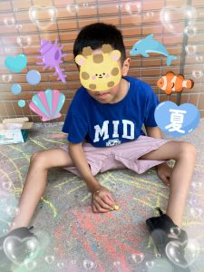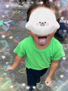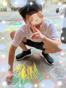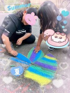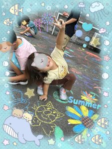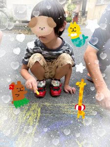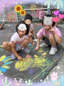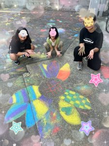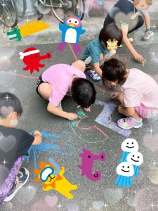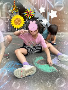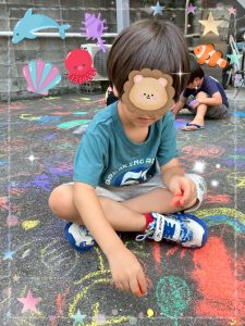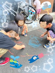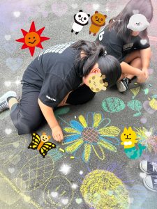「よーいスタート!」の合図で、それぞれ好きな色のチョークを手に取り、思い思いに描き始めます。高学年の子どもたちは協力して大きなお花を描いたり、ひらがなを覚えた子は自分の名前を書いてみたりと、個性あふれる作品が次々と生まれました。