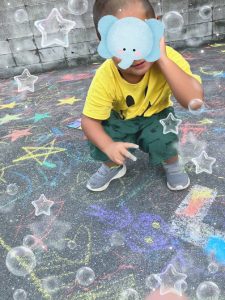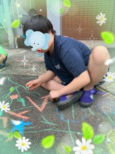 以前センサリープレイで触れたことのあるチョークに、子どもたちは「今日は何するの?」「どうやって描くの?」と始まる前からワクワク。