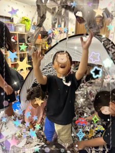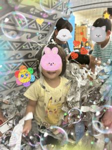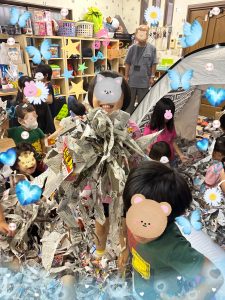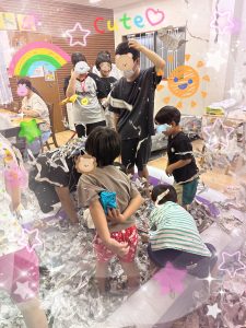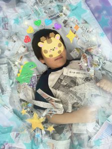新聞紙という身近な素材ですが、ちぎる・集める・潜る・かき分けるといった多様な動きを通して、感覚刺激だけでなく体幹や協調性も育むことができます。子どもたちが安全にのびのびと楽しめるよう、スタッフも一緒に入りながら活動を見守りました。