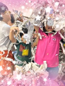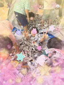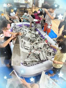 ある程度の量がたまると、大きなプールの中に新聞紙をどんどん入れていき、「新聞紙プール」が完成!子どもたちは全身で新聞紙に埋もれたり、上からバサッとかぶったりしながら大盛り上がりでした。