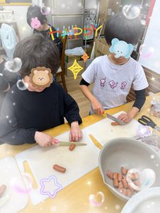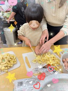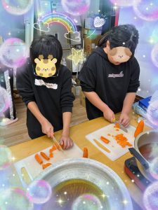 包丁の持ち方や手元に気をつけながら、役割分担をして取り組む姿が見られ、これまでのクッキング経験がしっかりと身についていることを感じる場面がたくさんありました。